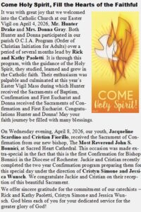 The Pastor and staff invite you and the people of St. John the Evangelist Church to joyfully celebrate the Eucharist, faithfully teach Catholic tradition, and enthusiastically form Catholic spirituality, so that together we may go forth in love to serve the Lord and each other.